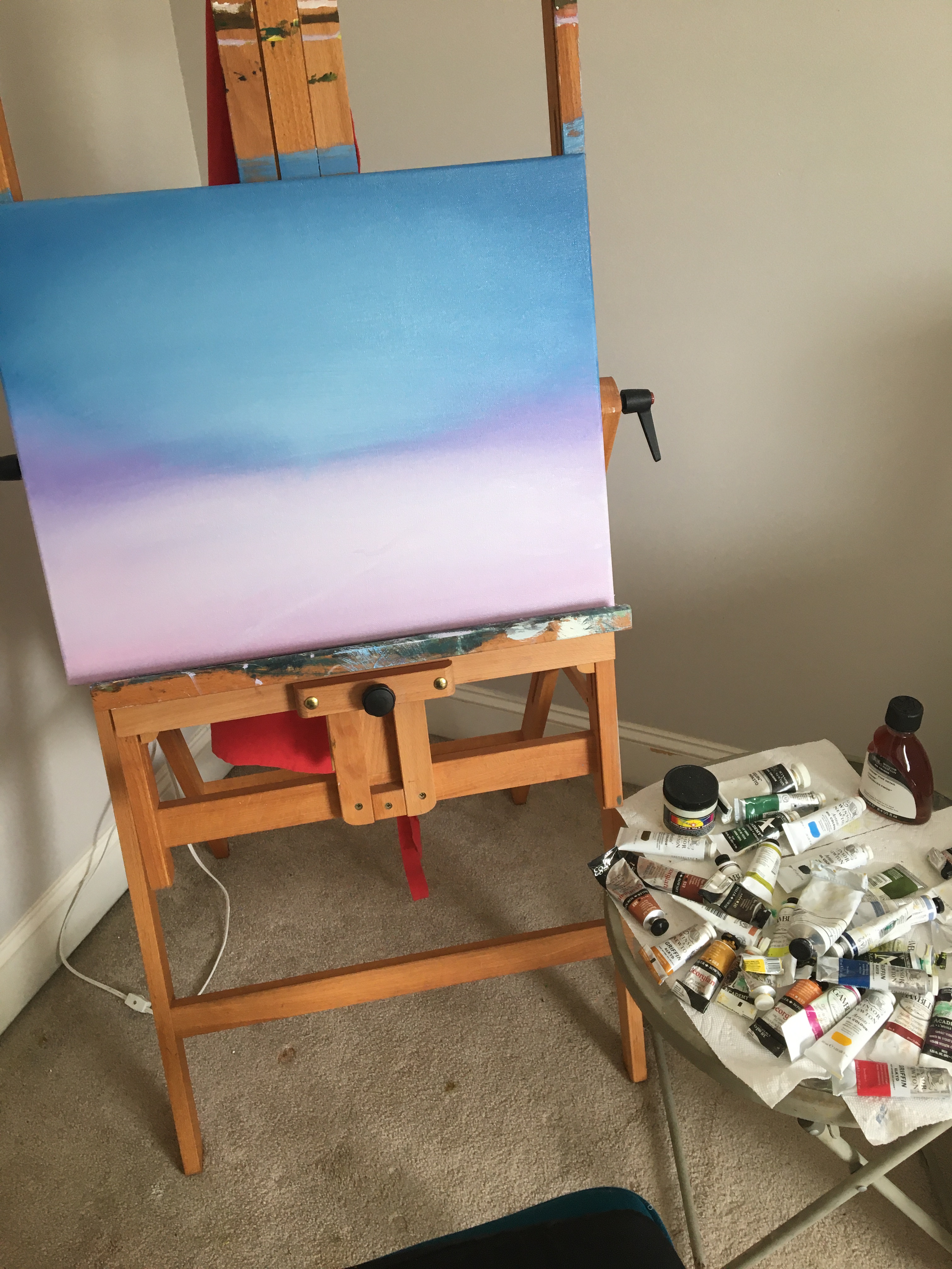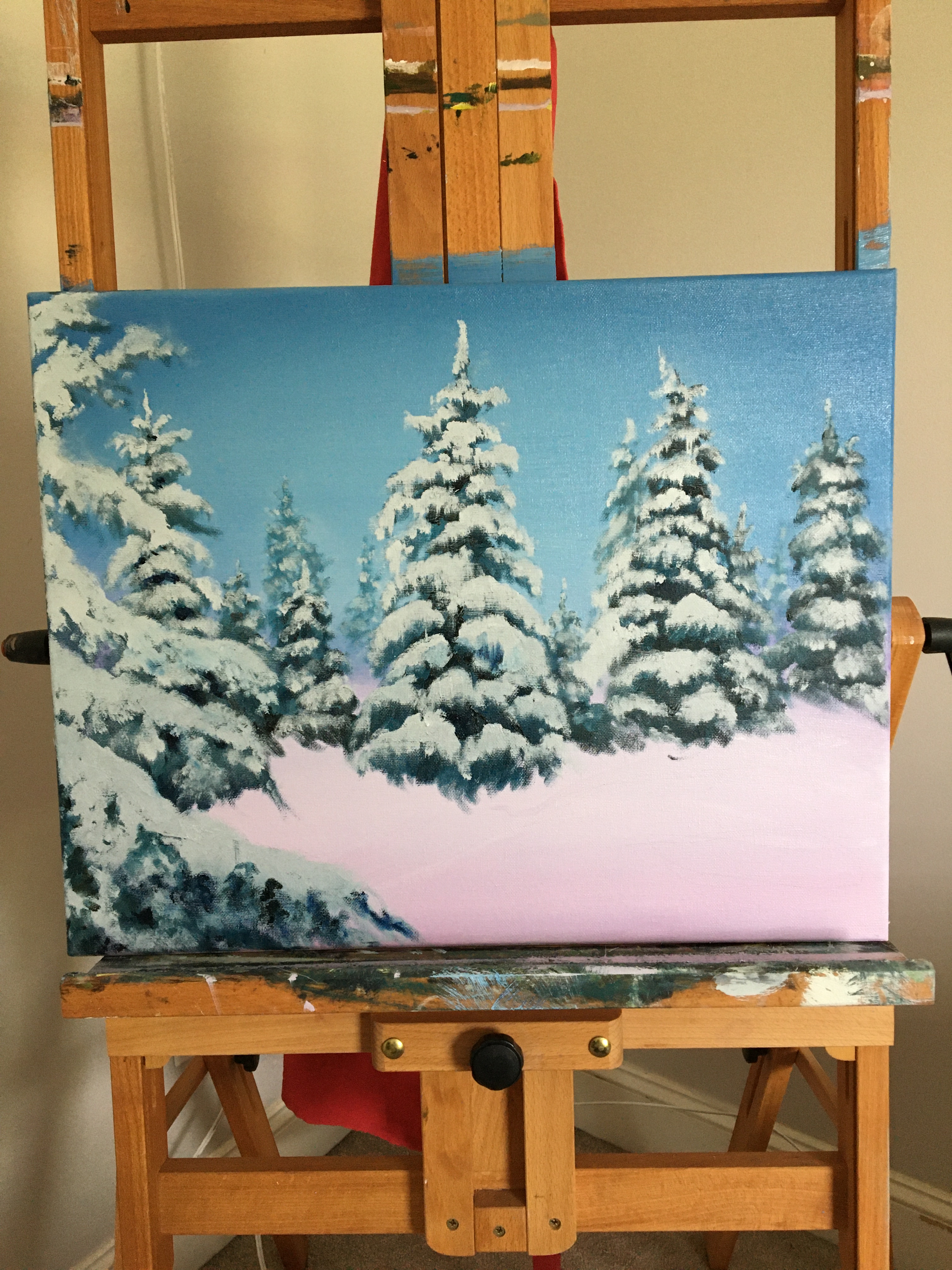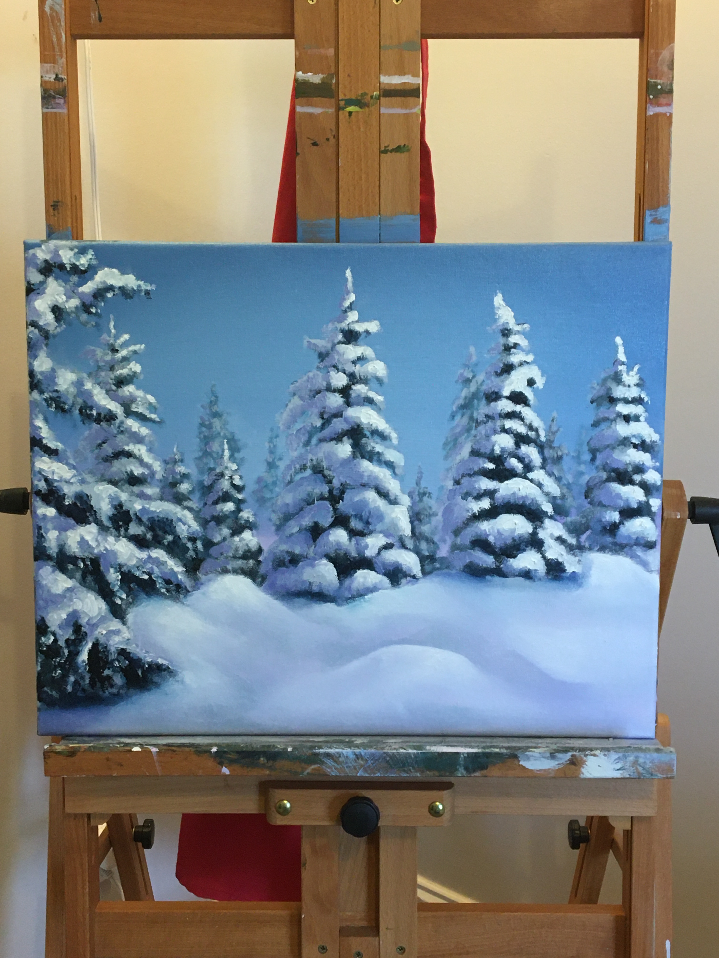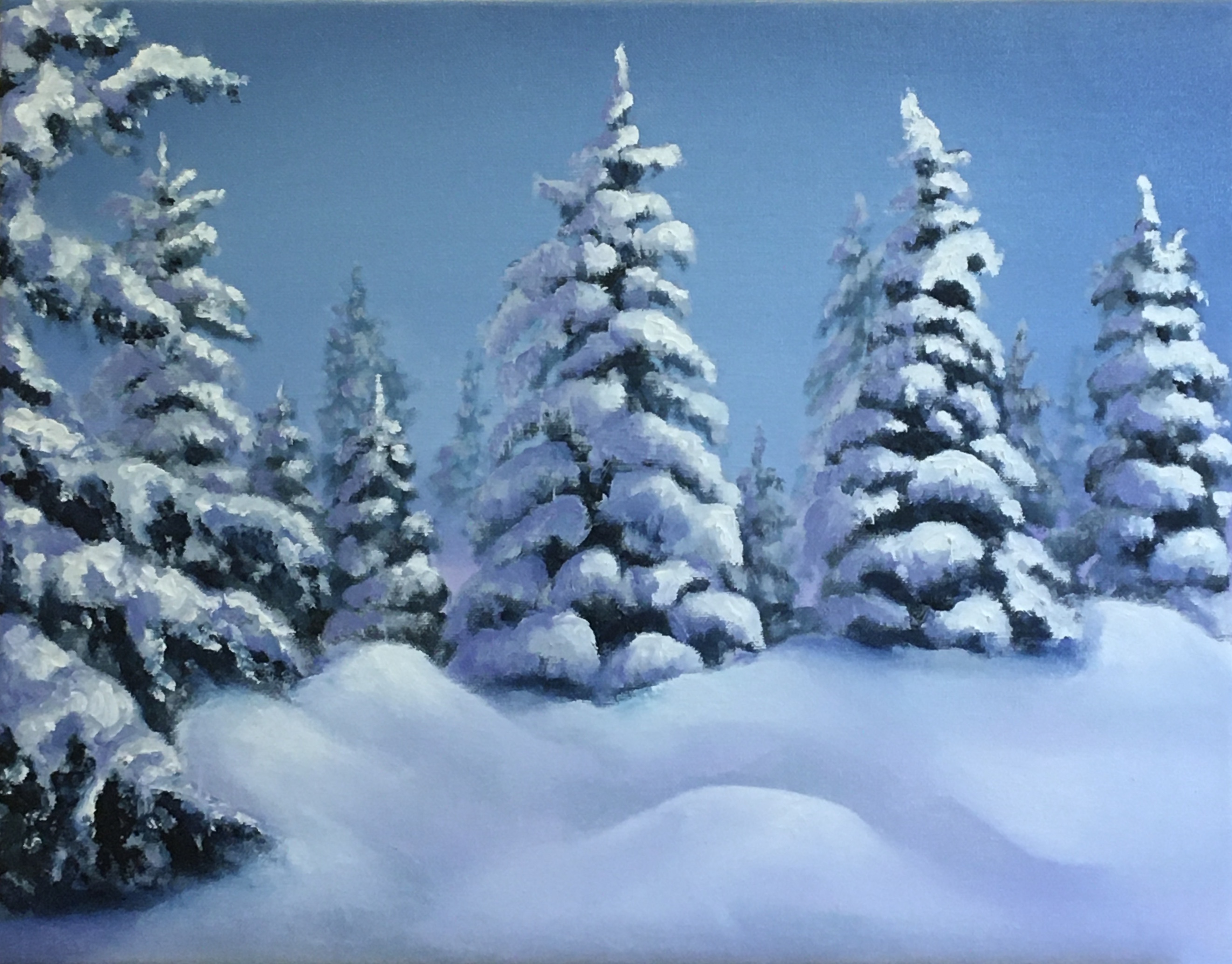 Recently I was approached and asked to sketch up a winter scene for an oil painting. The client asked for something with snowy evergreens that exuded a peaceful atmosphere. I sketched this out using graphtint and white charcoal. I wanted to be sure to use blues and purples as the undertone to highlight the chill in the air. The evergreen under painting was fun! I used a lovely peacock blue with some shades of browns to get that lovely tone. Lastly I was able to ice it all with a light blue and layered in some lavender lowlights and white pearly highlights. Lastly I brought a 2 inch brush over the whole thing to soften the image. I love how it turned out and I am so happy that the client did too!