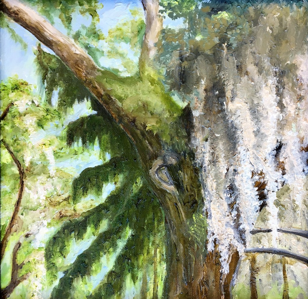 I was able to visit the Bonaventure Cemetery in Savannah, GA a few years ago. I was enraptured by the live oaks there with the moss covering the branches. I particularly loved the lighting effect on the moss here.
