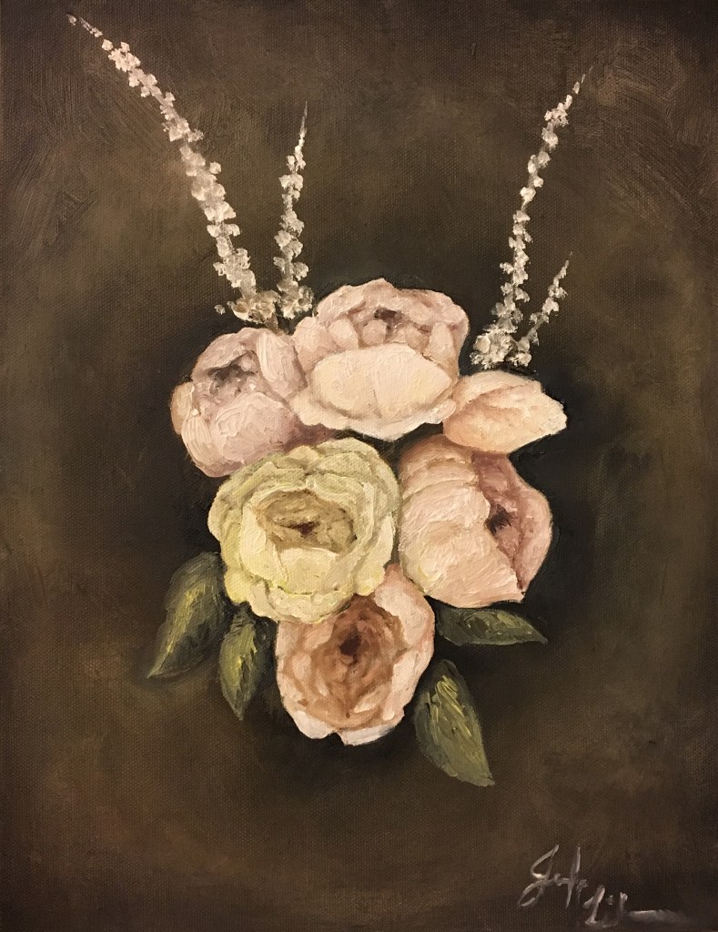 I love the romanticism of peonies. The delicate colors and lush shapes were a pleasure to create in oil. I paired the flowers with a warm dark background to create a glowing effect.