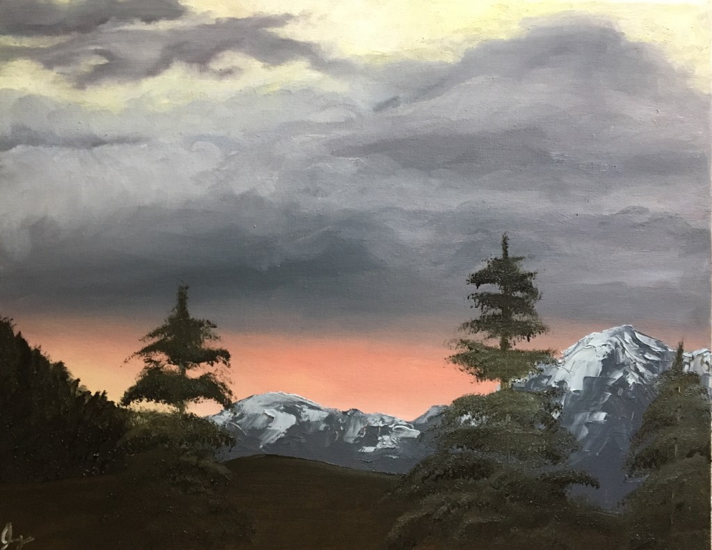 This was the view one evening at our lodge in Jackson Hole. The chill in the air shows with the weak light fading behind the snow capped mountains. I used extra thick paint on the snow and the foliage for added texture.