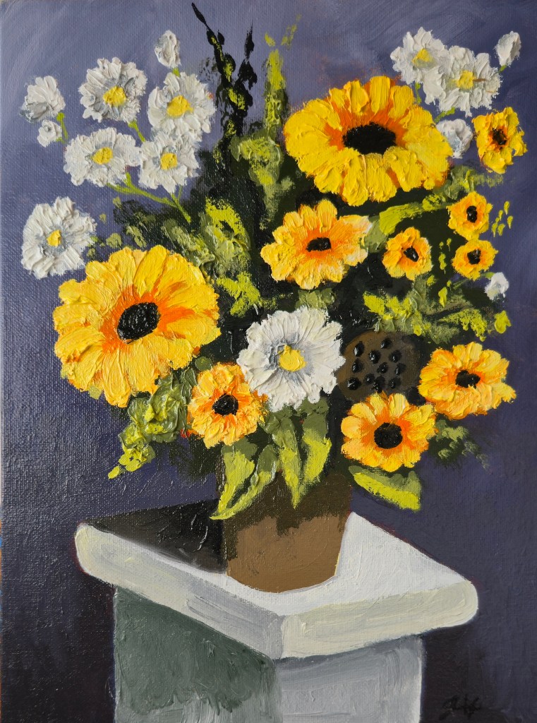 This was requested as a commission, and I ended up painting a second one as a test using paint thicker than I am used to. I love how it came out and the balance of the bright yellows with the grayed lavender background.