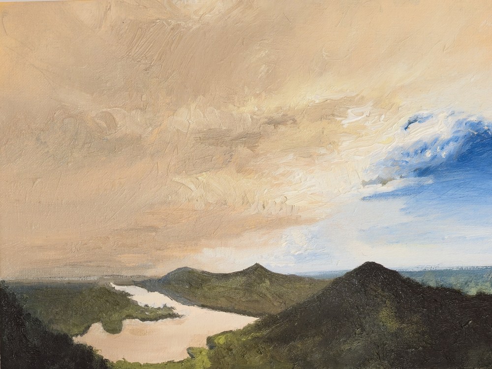 This is the scene from my back porch. This cloud formation was so captivating that I had to paint it. I was able to pair it with the lovely autumn foliage of the trees as well.