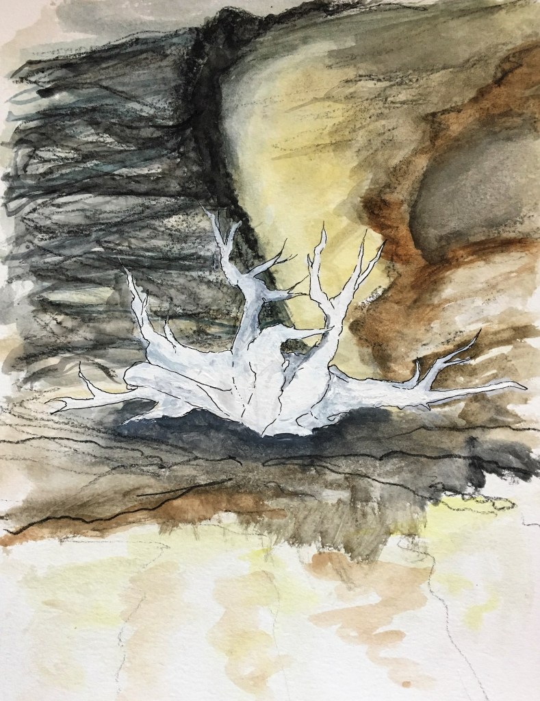 This piece allowed me to experiment with washes to create layers of moody hues. It reminded me of a glacial shore in the Arctic.